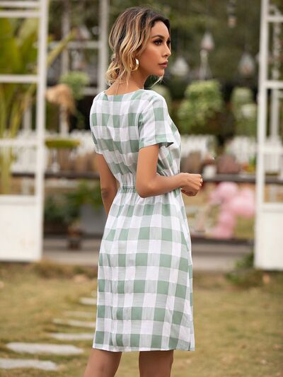 Smocked Plaid Round Neck Short Sleeve Dress