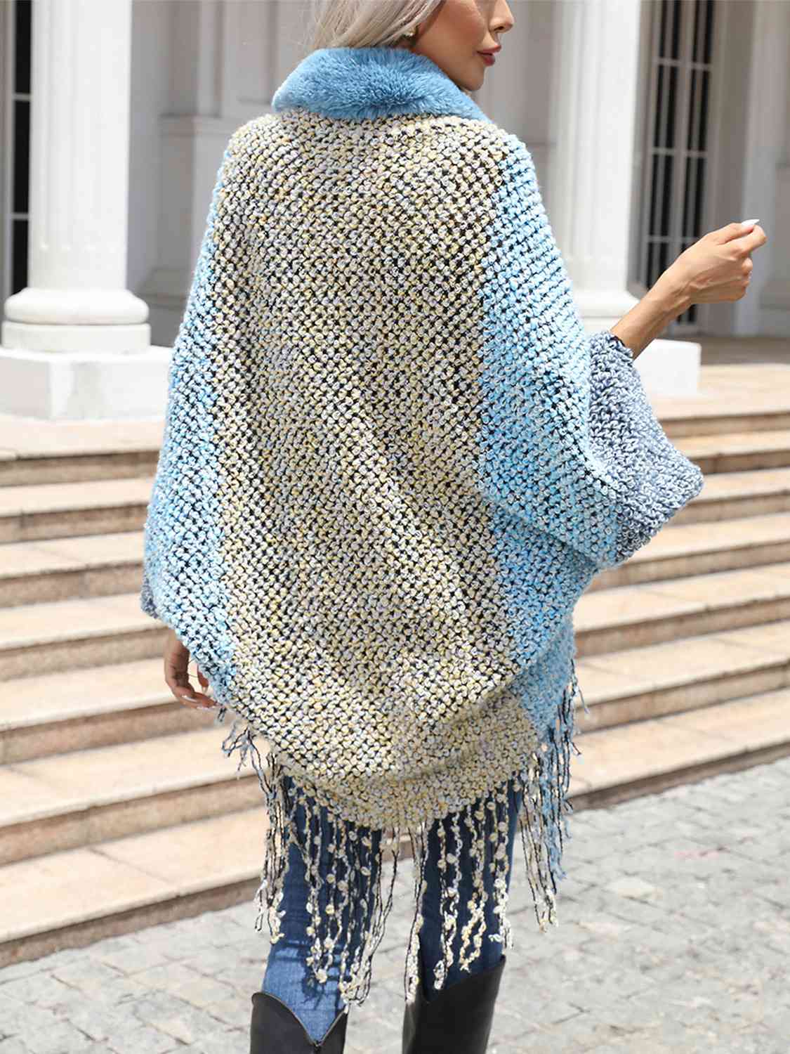 Color Block Open Front Fringe Hem Poncho