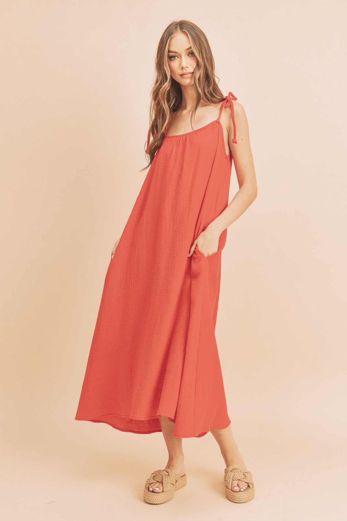Sultry and stunning for any occasion, this sweet Pyper midi features a braided tie at the shoulder, pockets and made with the softest cotton gauze fabric.