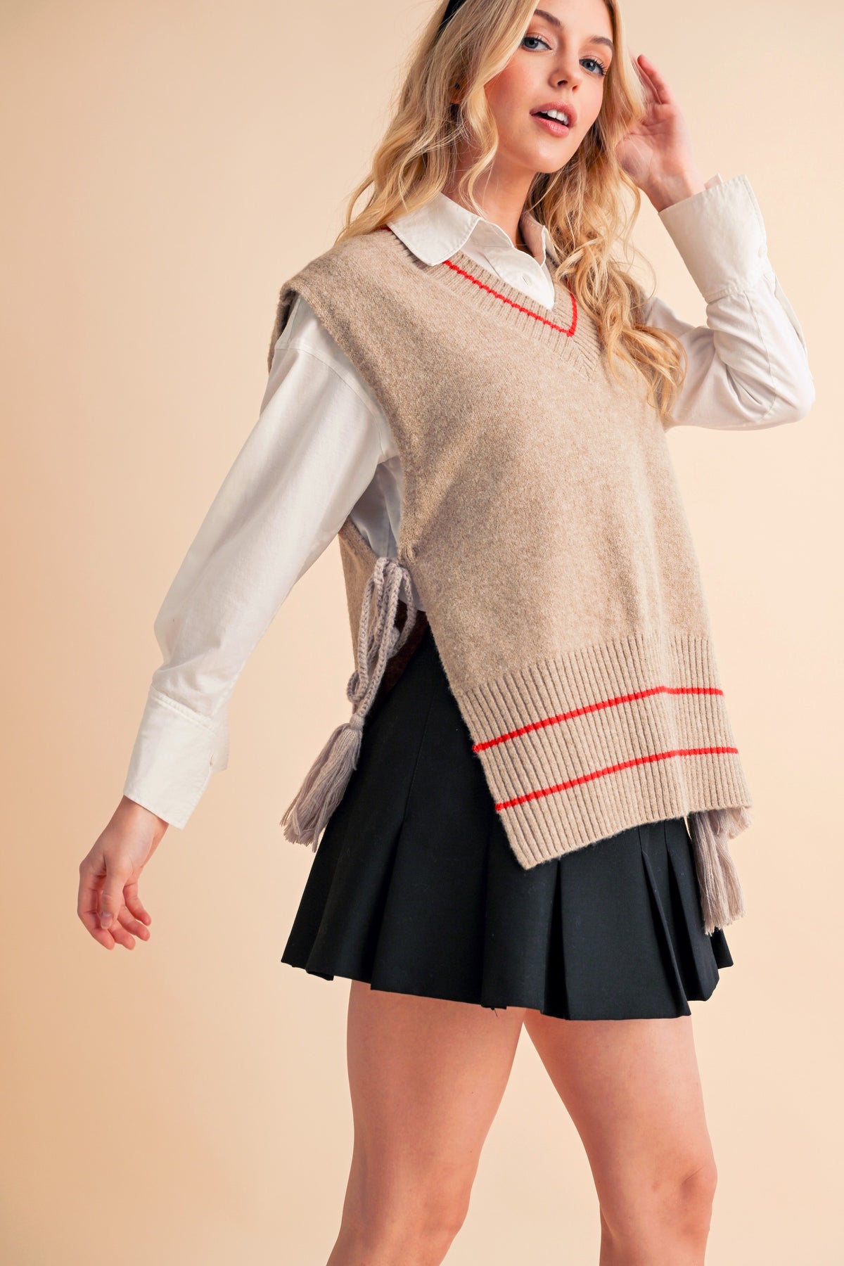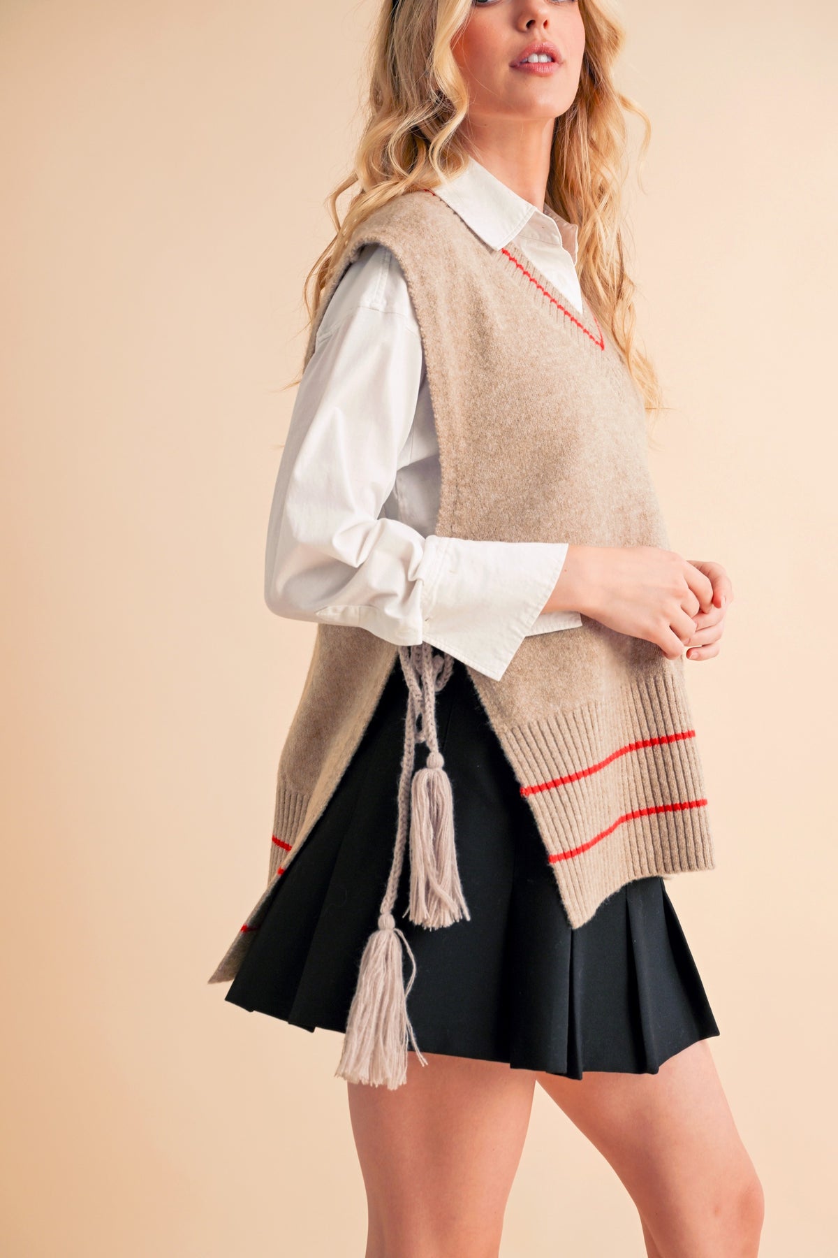 Aemi + Co Ribbed V-Neck Sweater Vest with Tassel