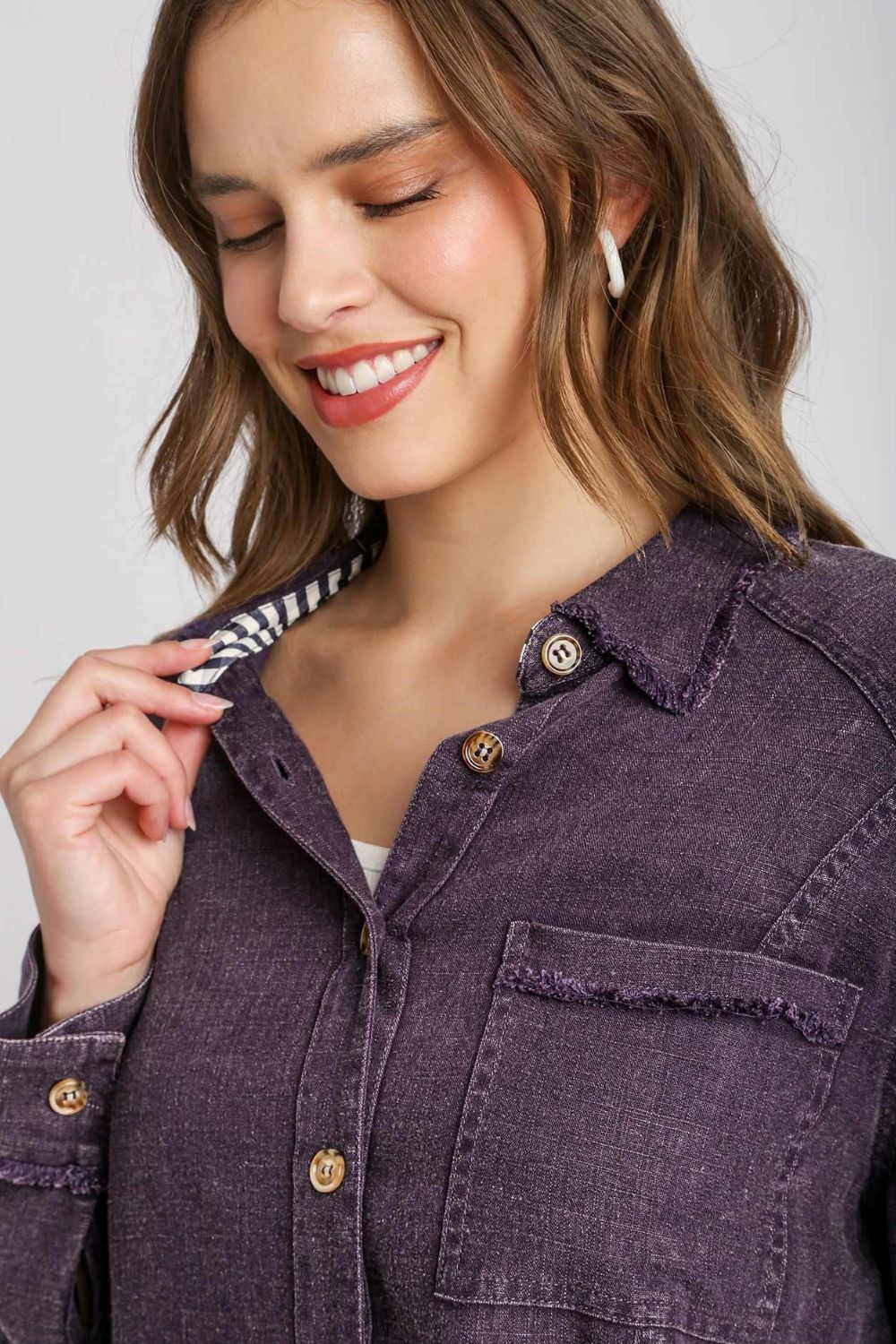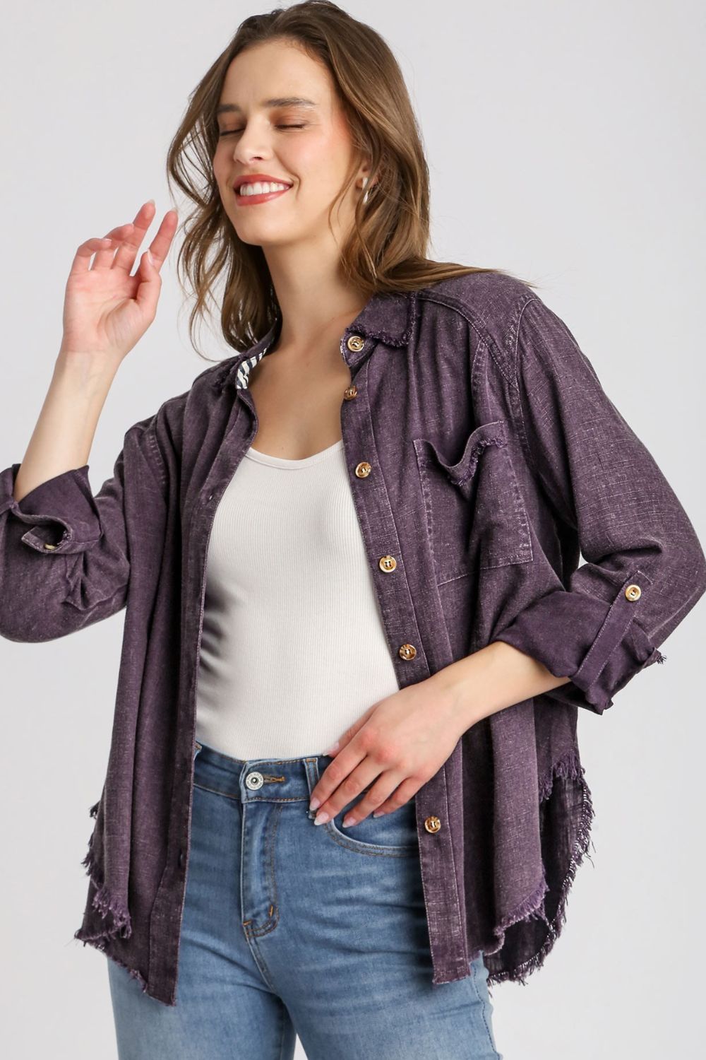 This shirt features a high-low hem design, creating a stylish and modern silhouette that is longer in the back and shorter in the front. The raw hem detailing gives a relaxed and edgy look, adding a touch of cool, undone style. The mineral wash gives the shirt a unique and worn-in appearance, adding a vintage vibe to the overall look. The button-down style provides versatility for styling options, whether worn open as a layering piece or buttoned up for a more traditional look.