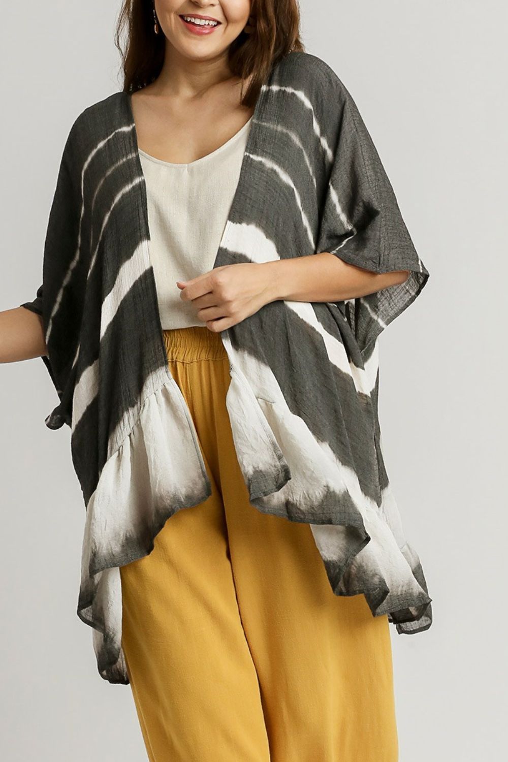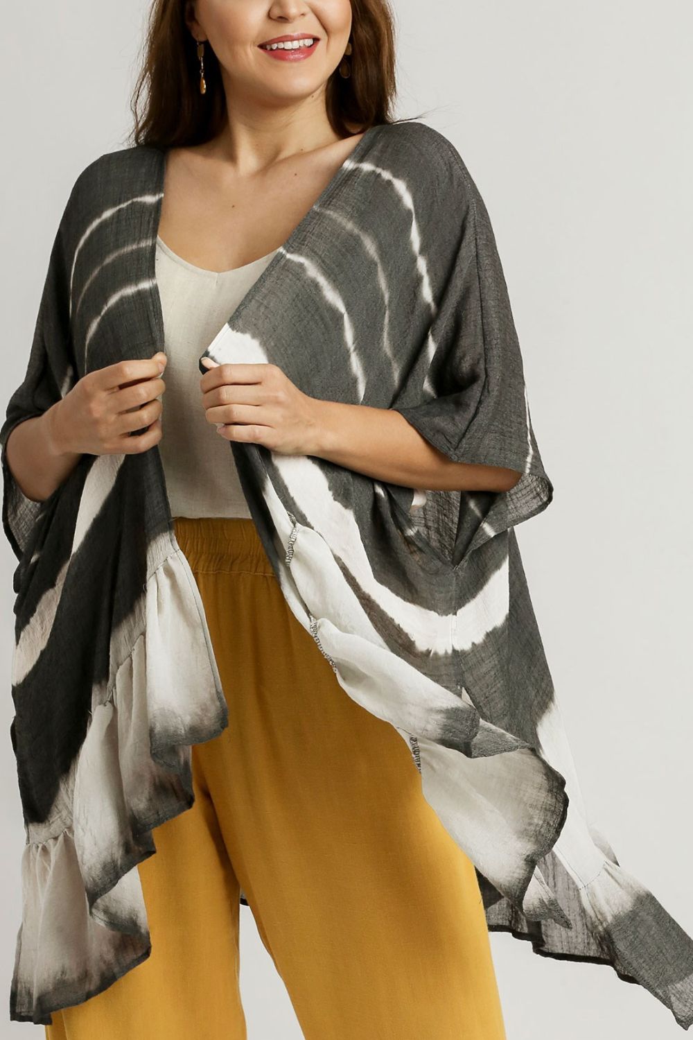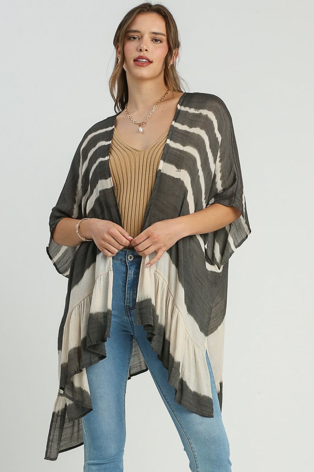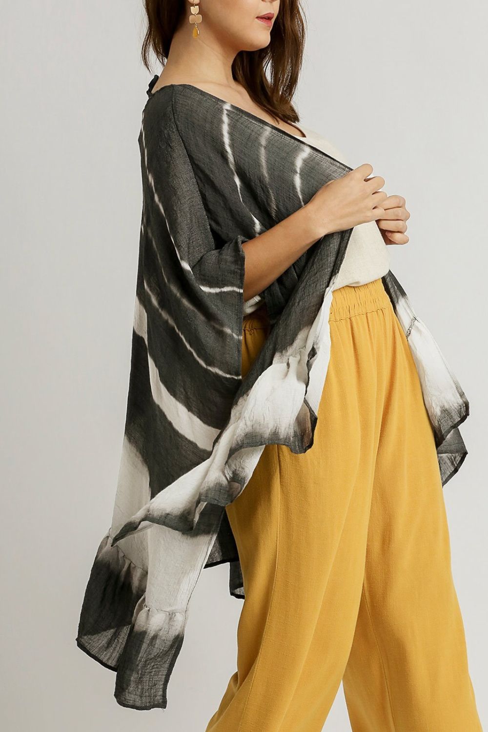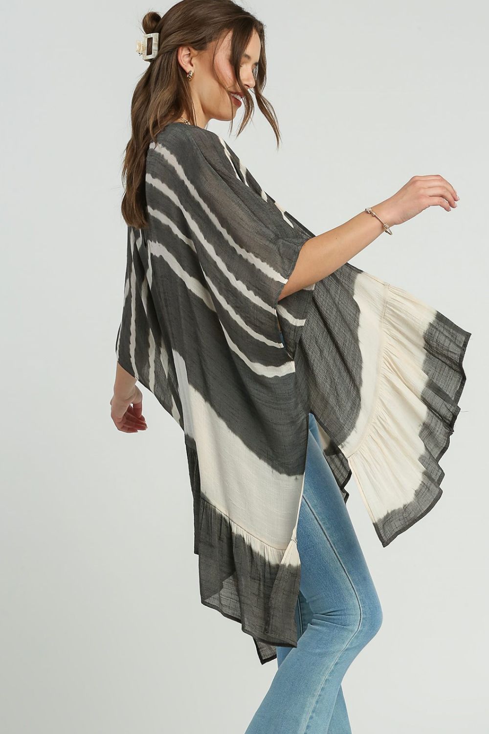 This cover-up features a tie-dye print on the back, adding a vibrant and eye-catching element to the overall design. The open front design allows for easy layering over different outfits, making it perfect for adding a bohemian touch to your look. The kimono sleeves are loose and flowy, providing a relaxed and comfortable fit.