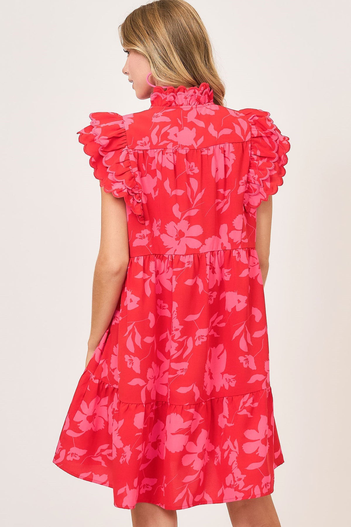 This mini dress features a two-tone floral print, combining two complementary colors for a unique and eye-catching look. The ruffle cap sleeves add a charming and playful detail, enhancing the overall femininity of the dress. The mini length offers a flirty and youthful silhouette, perfect for both casual outings and special occasions. With its floral print and ruffle sleeves, this dress exudes a fresh and stylish vibe that is sure to make a statement.