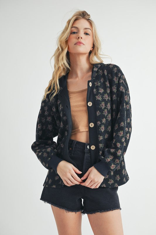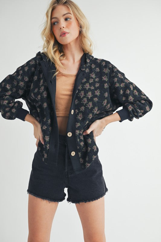The floral button-up hooded jacket is a versatile and stylish outerwear piece that combines a feminine floral print with practical design elements. Featuring a button-up closure for a classic look. The hood adds a touch of coziness and extra protection from the elements. Perfect for adding a pop of floral beauty to your outfit while staying warm and stylish.