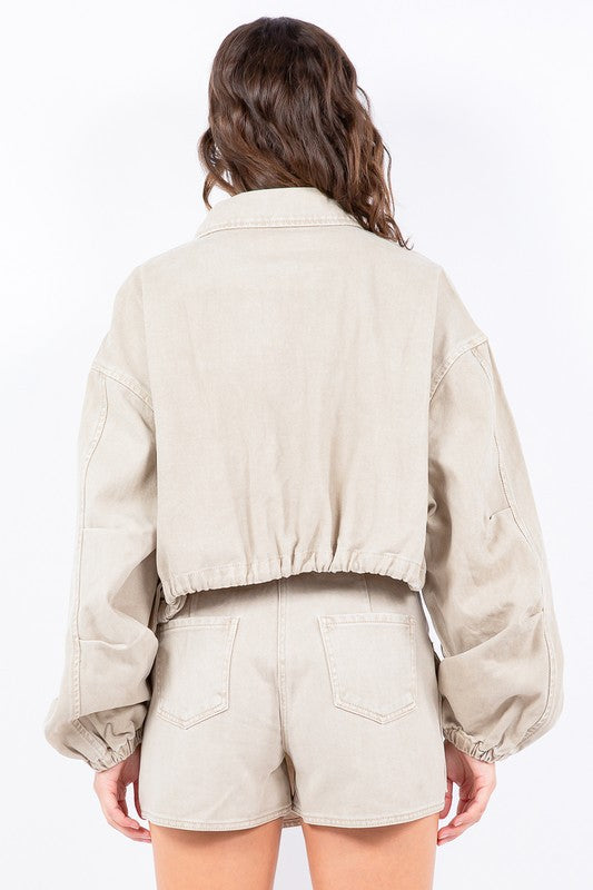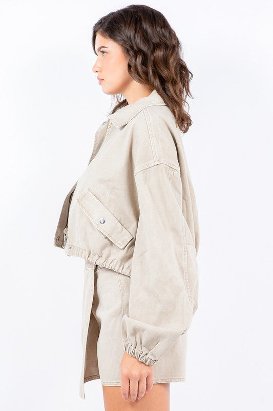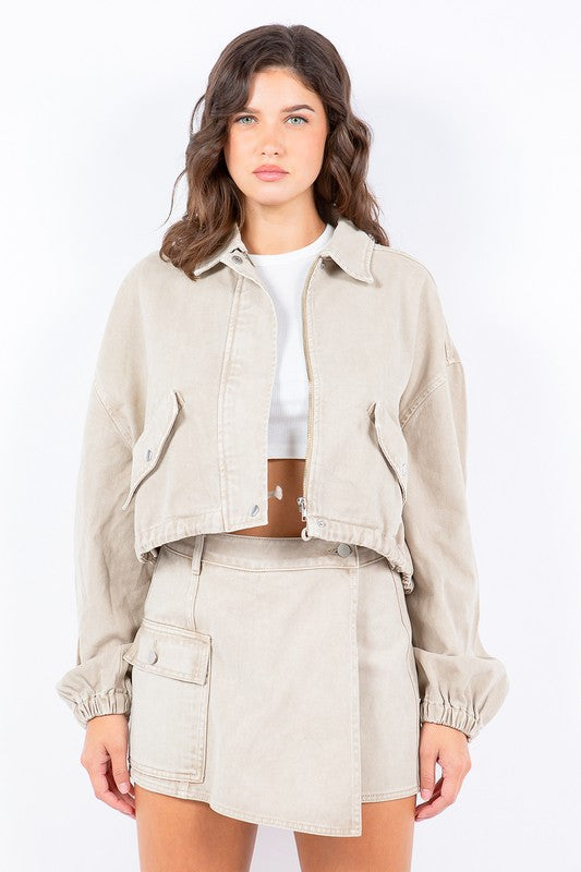 A drawstring waist crop jacket is a short jacket that typically falls at the waist or slightly above it. It comes with a drawstring at the waist which allows you to cinch in and adjust the fit according to your preference. This style of jacket is often lightweight and versatile, making it a great layering piece for various outfits.