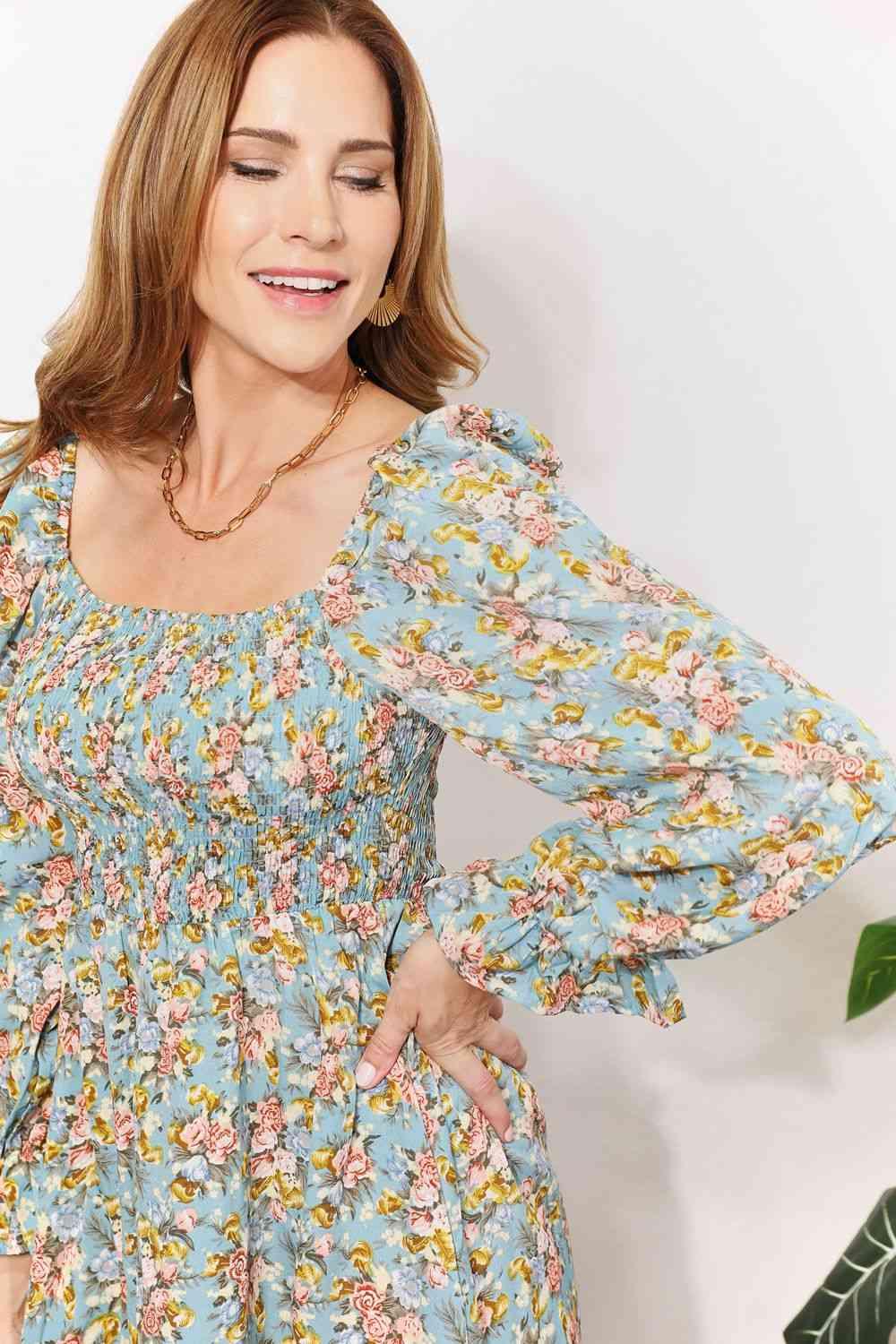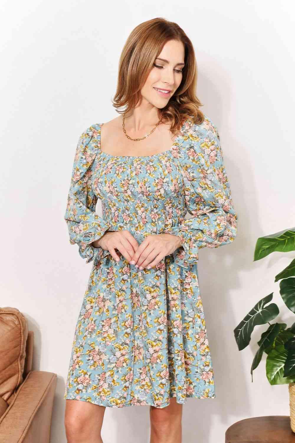 This mini dress features a beautiful floral print, adding a touch of femininity and charm. The smocked detailing adds texture and a flattering fit to the dress, while the square neckline and flounce sleeves add a romantic and playful touch. With its long sleeves, it offers both coverage and style. This floral smocked flounce sleeve square neck dress is perfect for both casual and dressy occasions, allowing you to look effortlessly elegant and chic.