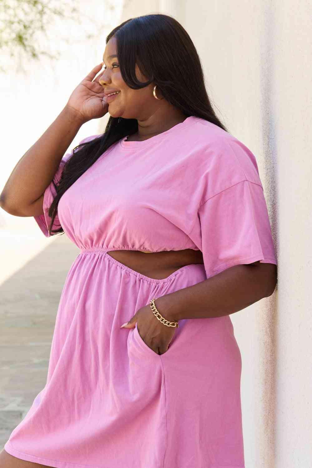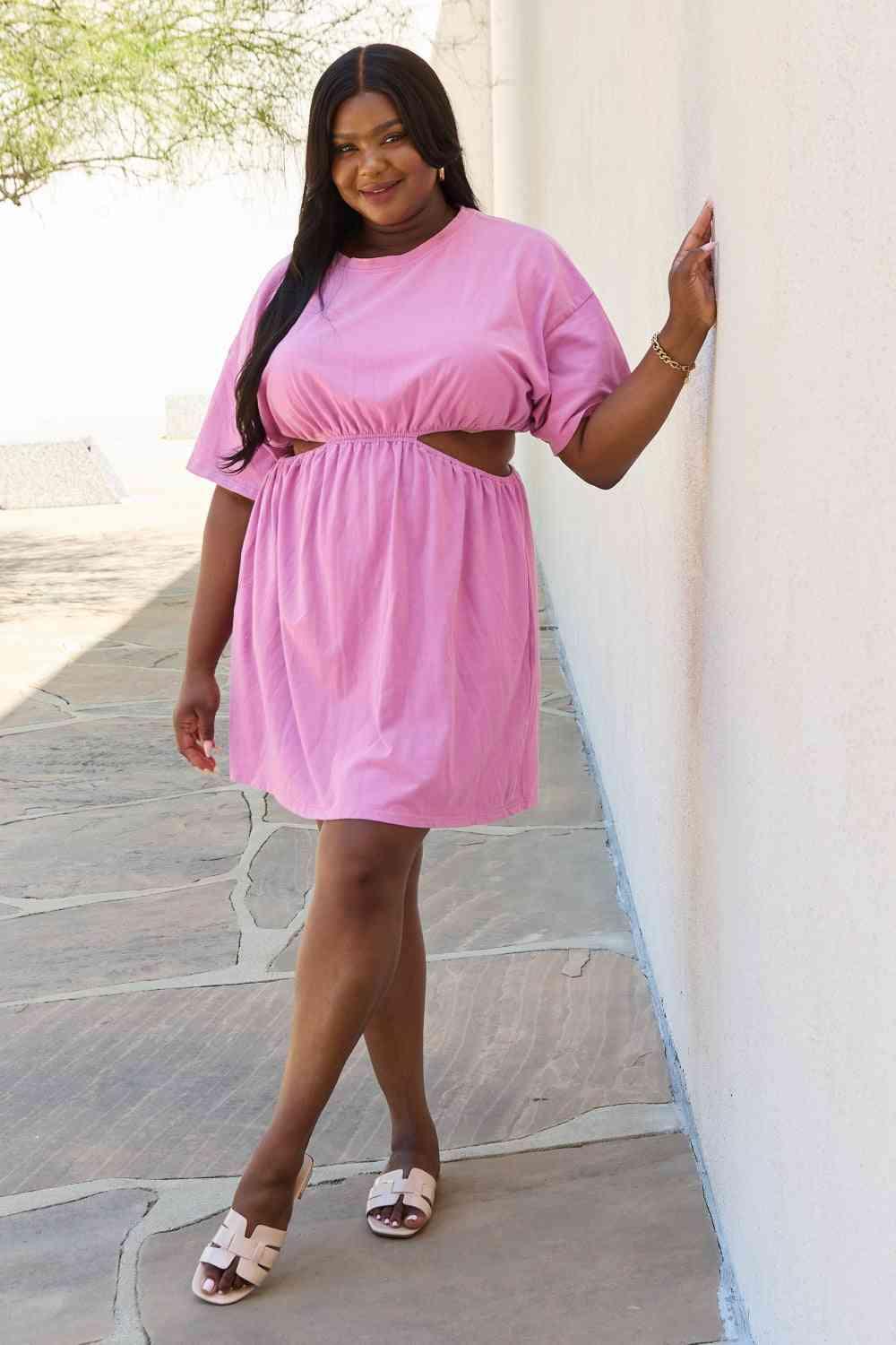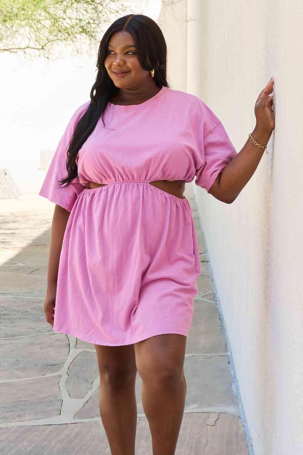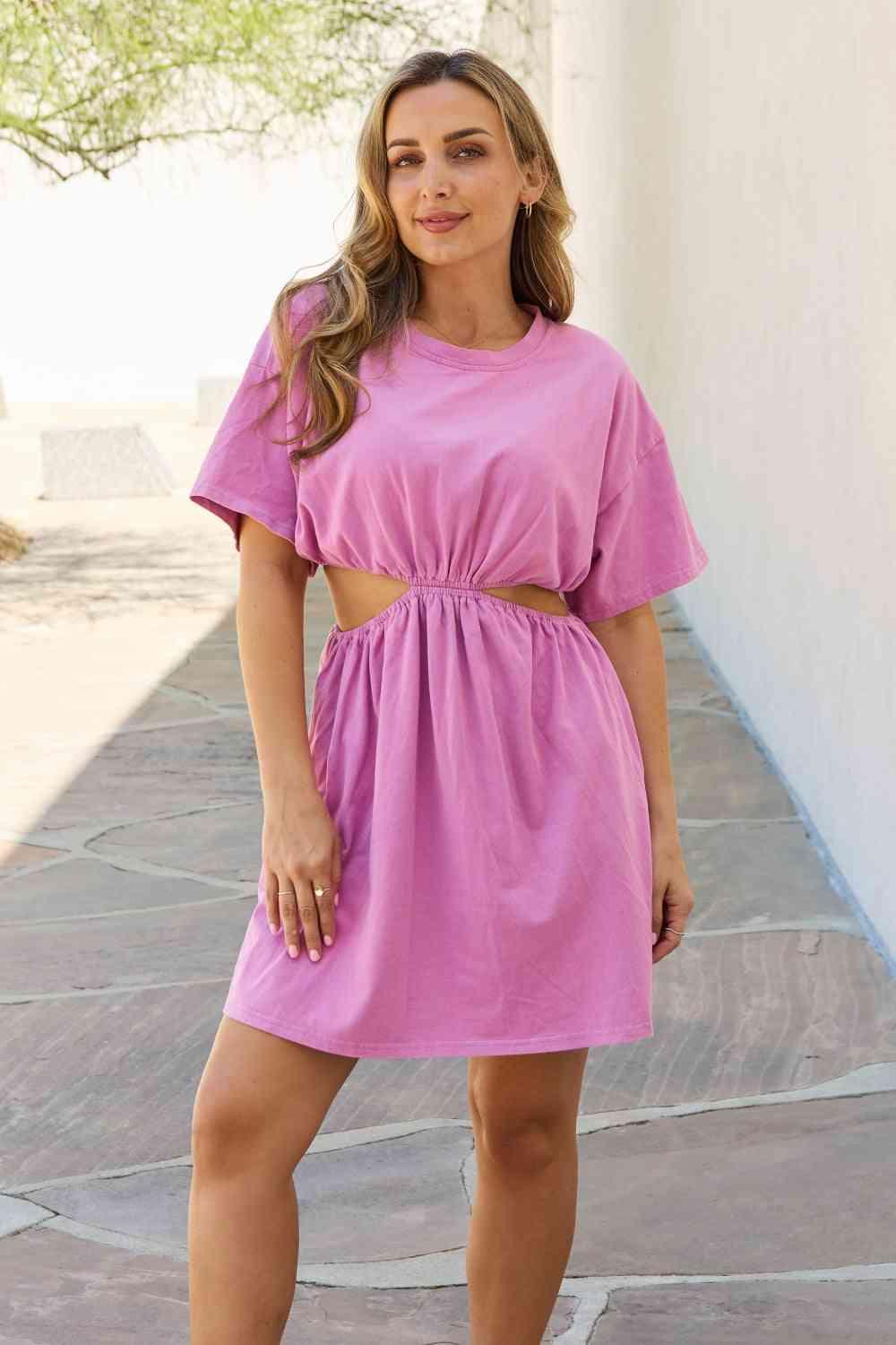 This versatile dress combines the ease of a classic t-shirt with the flair of contemporary fashion, making it a must-have addition to your wardrobe. This dress offers a soft and breathable feel that keeps you cool and comfortable all day long. The washed finish adds a touch of vintage charm, giving the dress a relaxed and lived-in look. Whether you're running errands or meeting friends for brunch, this dress will effortlessly elevate your ensemble. The standout feature of this dress lies in its side waist cutouts, which add a dash of allure and contemporary edge to the design. These strategically placed cutouts create an eye-catching detail, revealing just the right amount of skin without compromising on modesty.