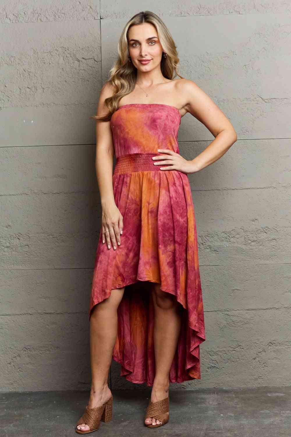 Designed with versatility in mind, the high-low hemline adds an extra flair to the dress. The front showcases a shorter length, allowing you to showcase your favorite sandals or heels, while the back cascades gracefully to create an elegant and flowing look. It's the ideal balance between fun and sophistication. The elastic waistband provides a comfortable and flattering fit for all body types. It cinches the waistline just enough to accentuate your curves while maintaining a relaxed and effortless feel. Whether you're attending a summer garden party or simply strolling along the beach, this dress will make you feel both comfortable and stylish.