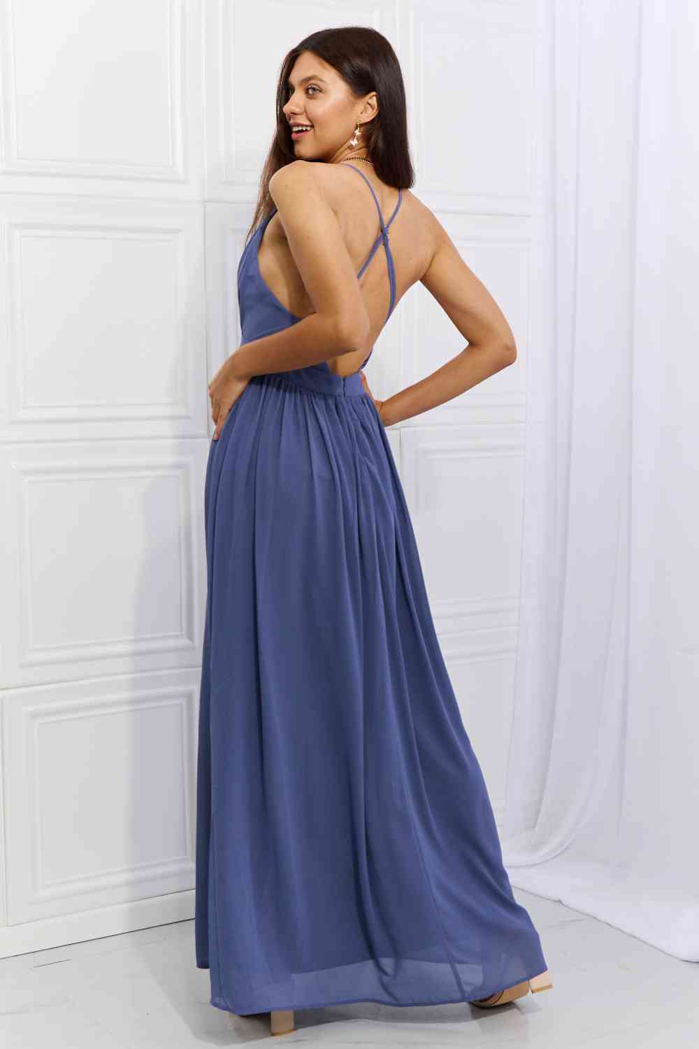 But the real showstopper is the open cross back detail. This eye-catching feature adds a dose of drama and a modern twist to the classic maxi dress silhouette. It beautifully frames your back, accentuating your curves and drawing attention with its intricate and captivating design. Whether you're entering or exiting a room, all eyes will be on you. The fabric is soft, breathable, and drapes gracefully over your body, ensuring a flattering fit for all body types. It's the perfect balance between style and comfort.