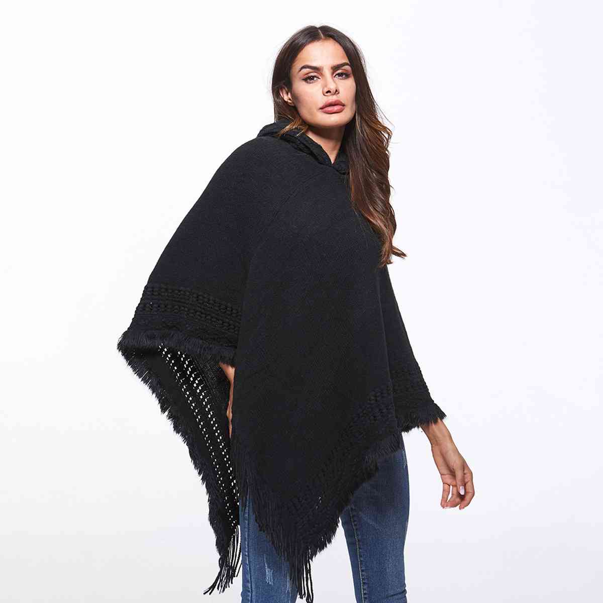 Openwork Fringe Hem Hooded Poncho