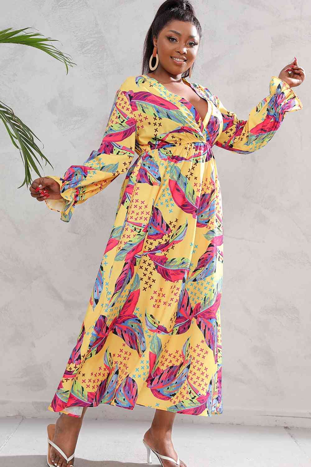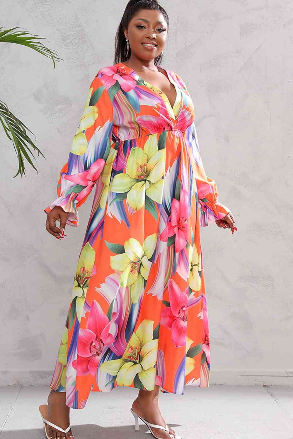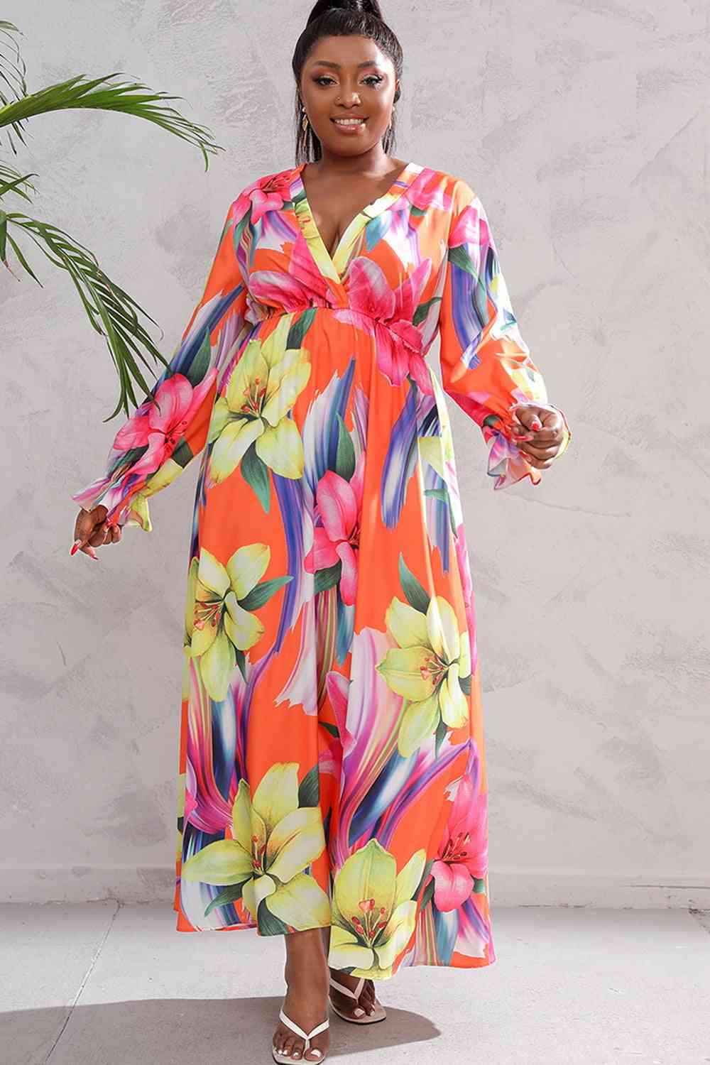 Plus Size Printed Flounce Sleeve Maxi Dress