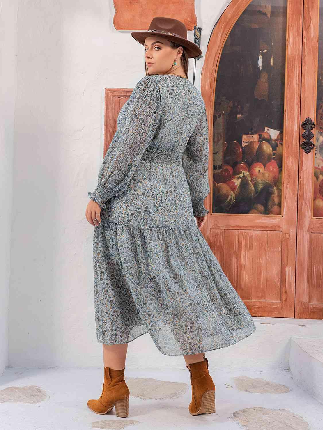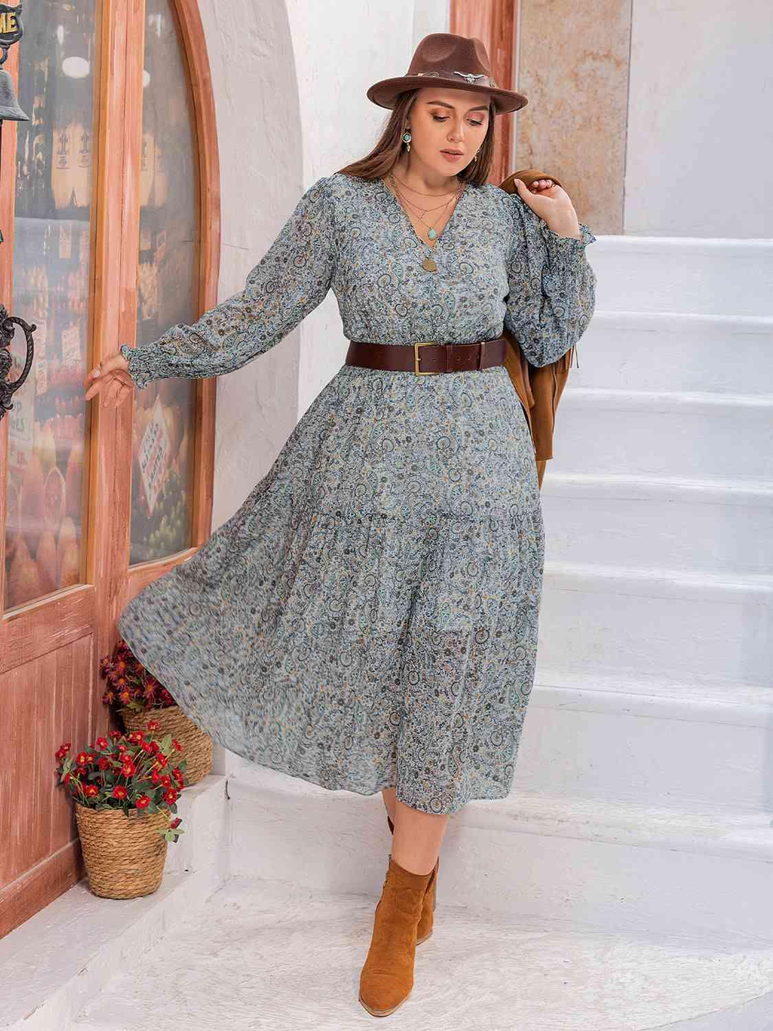 Plus Size V-Neck Long Sleeve Midi Dress