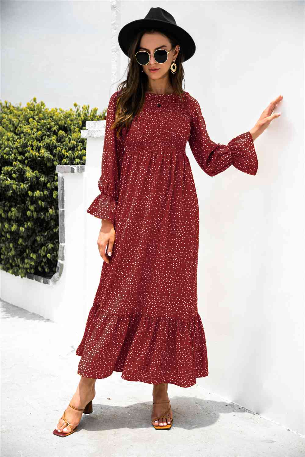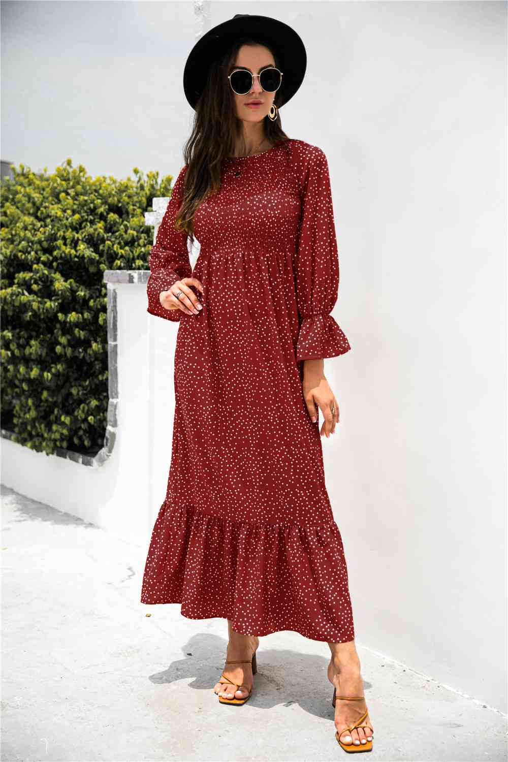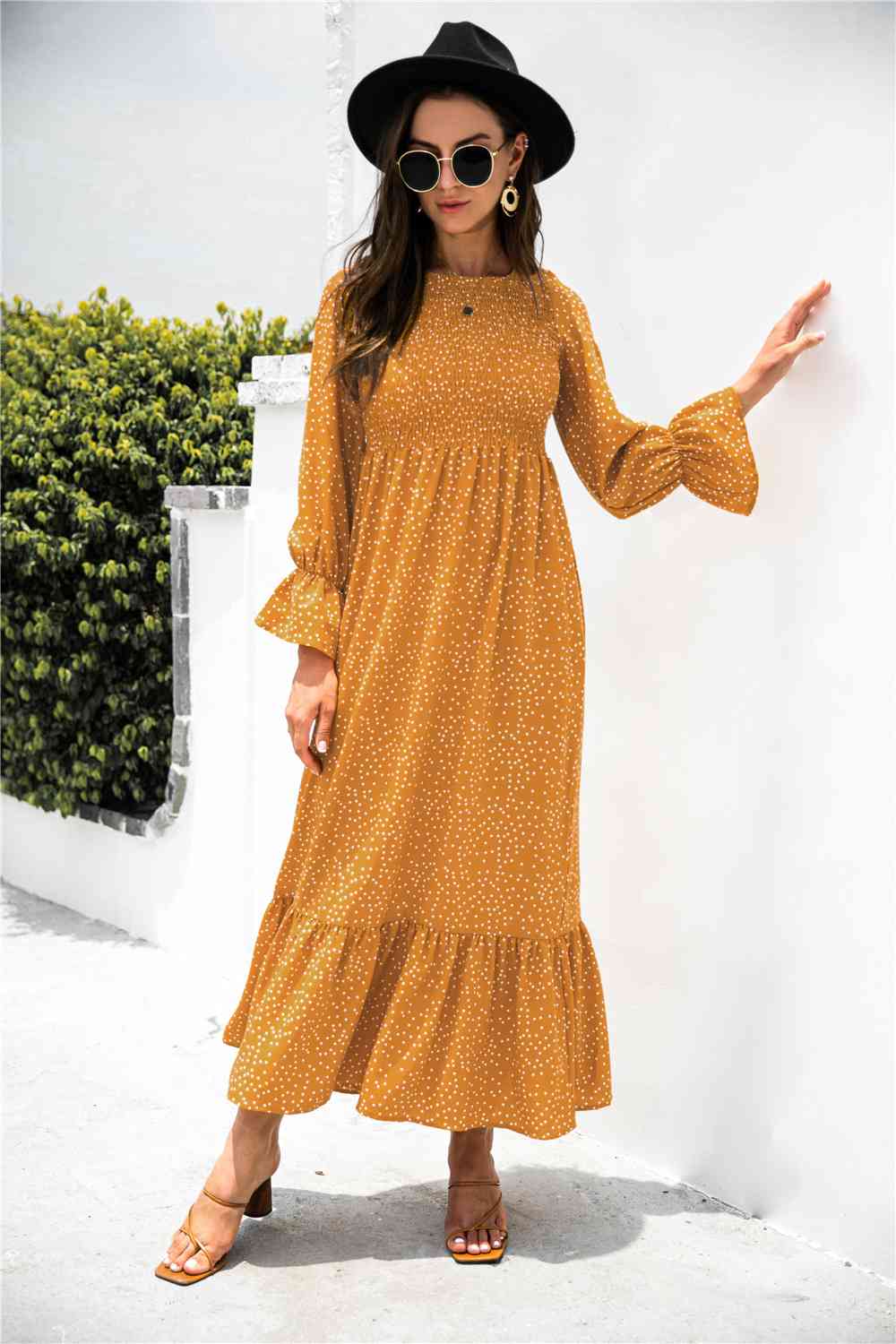 - Feature: Long puff sleeve, patchwork, mid rise, ruffle hem, swing dress