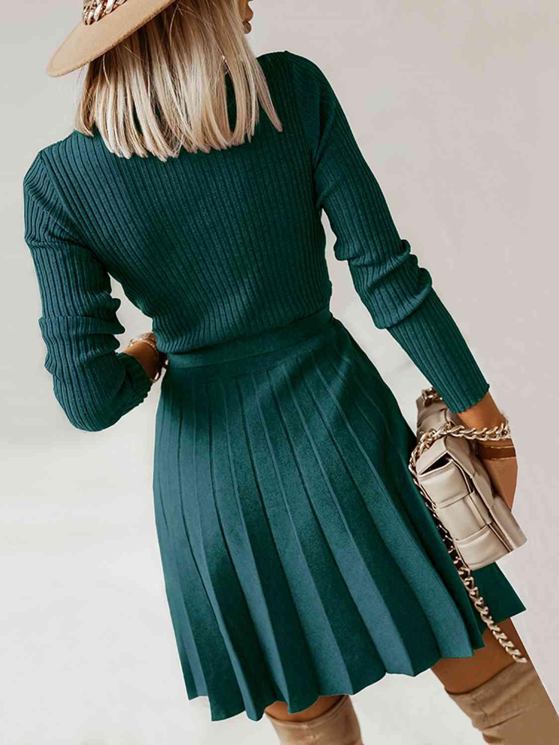 Surplice Neck Tie Front Pleated Sweater Dress