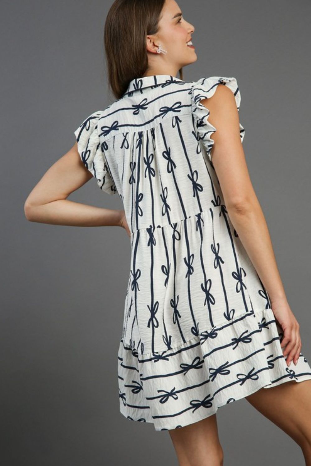 Step out in style with the Ribbon Collared Mini A-Line Dress featuring Short Ruffled Sleeves. This chic dress combines a classic A-line silhouette with a playful ribbon collar and ruffled sleeves for a charming and feminine look. Perfect for a variety of occasions, this dress exudes elegance and sophistication. Embrace a timeless yet trendy aesthetic with this versatile piece that will have you looking effortlessly chic.